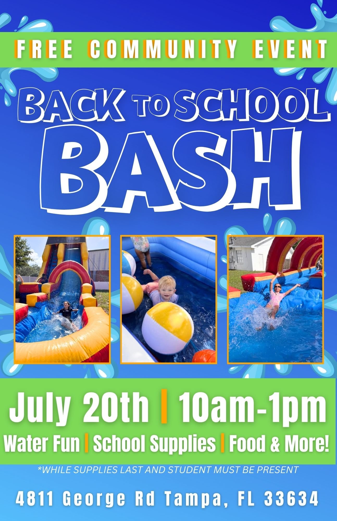 Activities: Water Fun, School Supplies, Food & More! Note: While supplies last and student must be present.